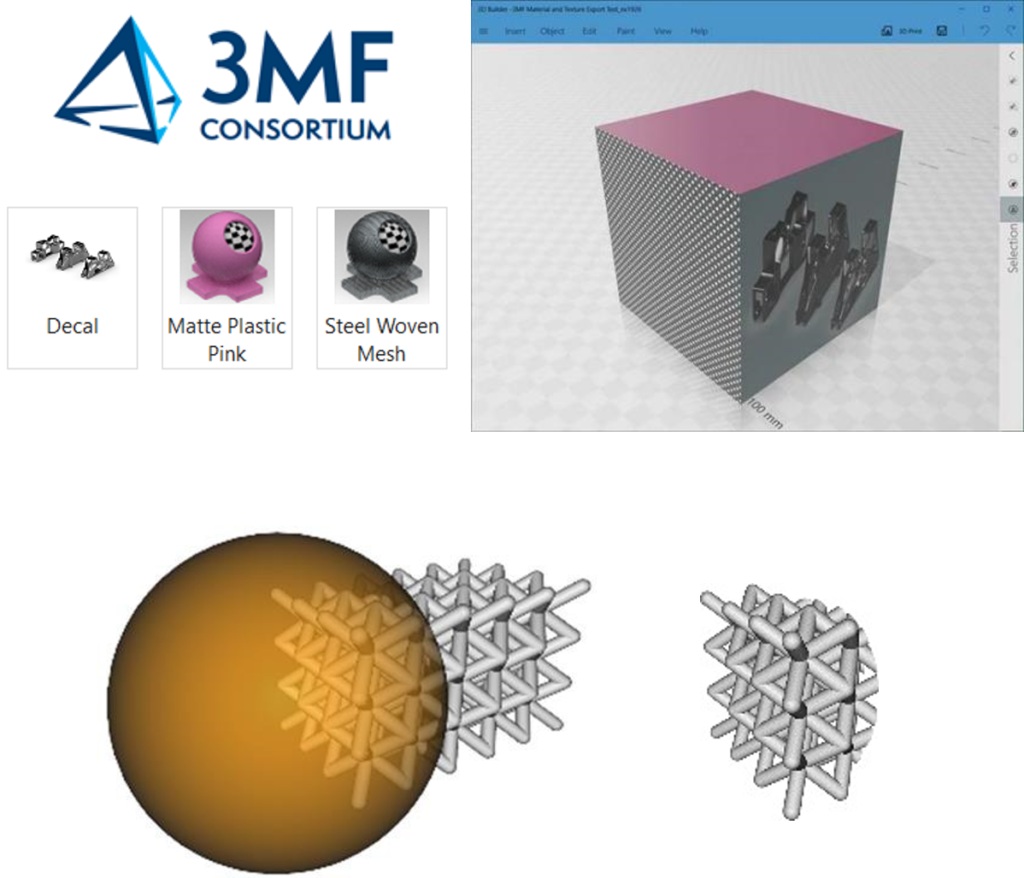Xuất màu body và các mặt, độ nhám vật liệu trực quan. Cải thiện sự hợp tác giữa cộng đồng các OEM (Nhà sản xuất phụ tùng gốc) cho sản xuất bồi đắp, nhà cung cấp và phòng dịch vụ . Hiệu suất cắt lát được cải thiện đáng kể bằng cách sử dụng biểu đồ mạng trực tiếp từ 3MF. Các tính năng mới của 3MF là
